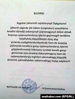 Şol bir wagtyň özünde, keselhanalarda dem alyş keseller we maska dakynmak barada resmi bildirişler peýda boldy. Bildirişlerde COVID-19 agzalmaýar.